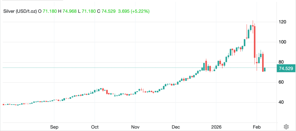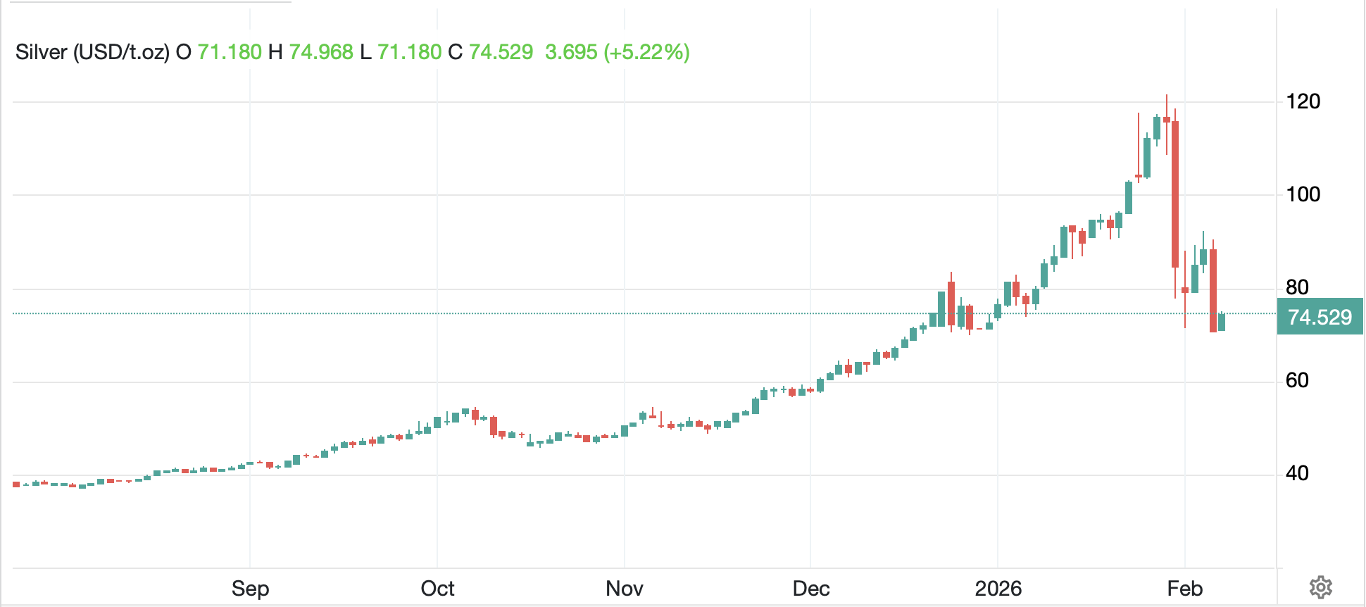 Silver (+4.75%), which had a 34% range last Friday and has fallen 39% since its high 8 days ago: