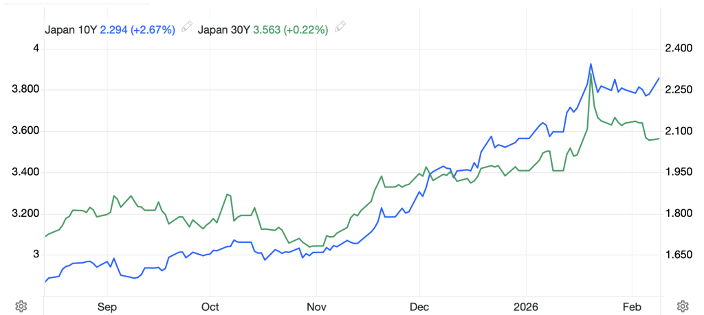 In the equity markets, yesterday saw a tough day in the US as the tech/AI story continues to get beaten up right now, and that was more than enough to offset strength in things like defensives and staples. But this morning, US futures are higher by about 0.5% as I type (8:00). In Asia, Japan (+0.8%) bucked the US trend on the back of excitement about the upcoming election where Takaichi-san is expected to gain a mandate. However, China (-0.6%), HK (-1.2%), Korea (-1.4%) and Australia (-2.0%) all had the same fate as the US. Given the weight of technology companies in Asian indices, I suspect we are going to see more volatility here as different narratives come about on AI and investment and the social/political impacts. As to Europe, modest gains are the story with the DAX (+0.5%) and IBEX (+0.9%) leading the way higher with the former benefitting from yesterday’s surge in Factory orders as well as a better-than-expected trade balance today. As to Spain, it has been trending higher and nothing has come out to change that view for now.
