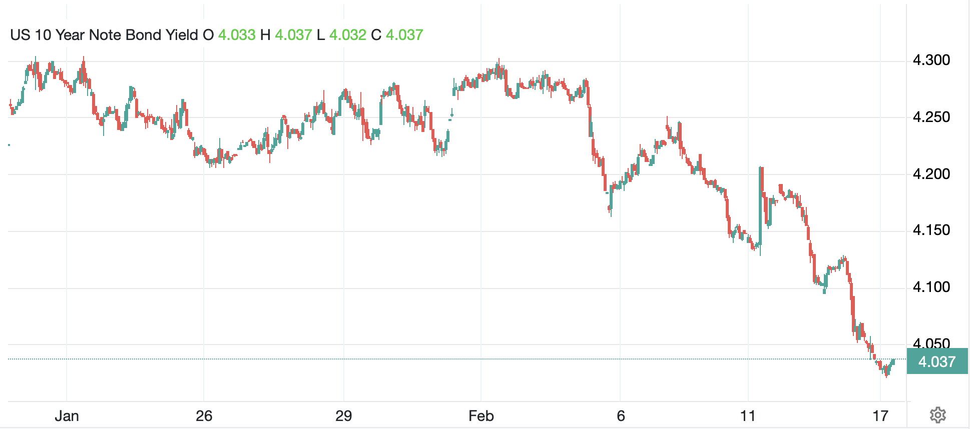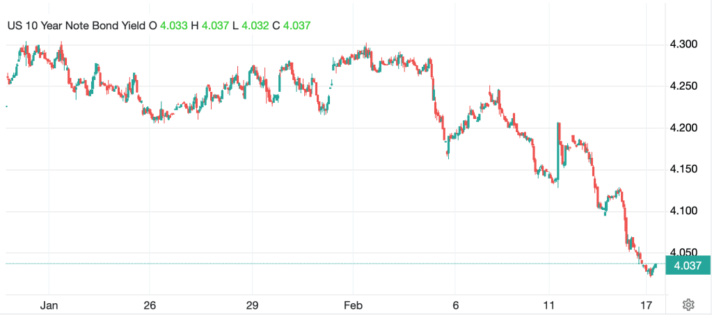 In the bond market, right now, the inflationistas are having a hard time explaining the decline in yields. Treasury yields (-2bps and back to 4.03%) have been marching lower for the past two weeks as per the below, and we have seen similar price action elsewhere.