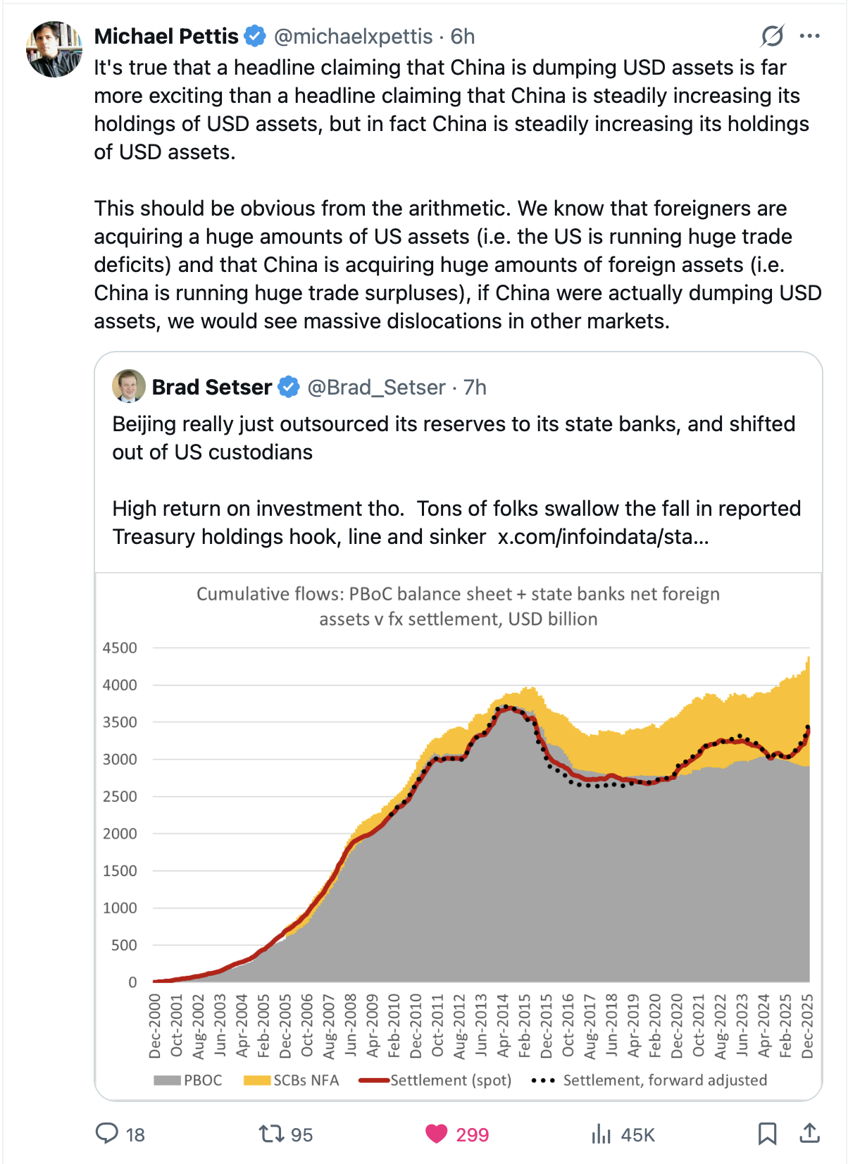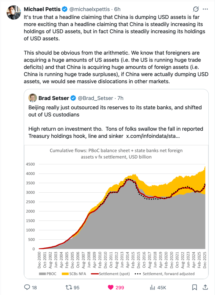 And of course, a large part of this particular currency discussion is that the Chinese are ‘dumping’ US assets, notably Treasuries. Alas, recent data as per the below from two of the best-informed analysts regarding China and its activities shows that the PBOC has basically been offloading Treasuries to State owned Chinese banks and their US assets are, in fact, growing. The CNY is a completely managed currency and can be set at any level the PBOC chooses. Exclaiming the dollar is falling against it is not a very good representation.