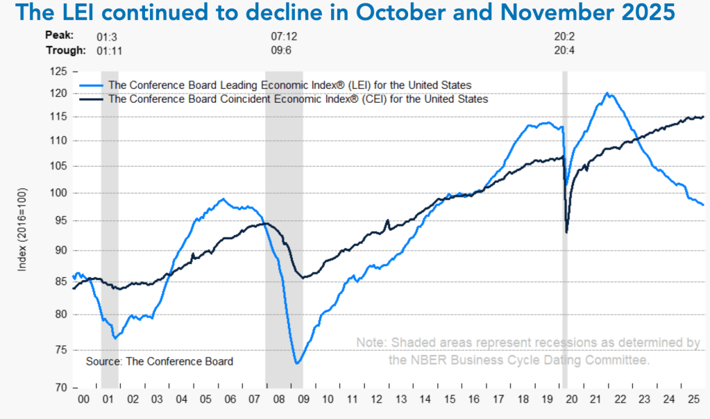 Data yesterday was generally stronger than forecast, notably IP and Capacity Utilization, which showed solid outcomes that were ascribed to AI infrastructure building as well utilities activity. It strikes me this is exactly what the Trump administration is trying to achieve with their reshoring goals. I guess the question is how productive this investment will be and how will it impact inflation readings. This morning, we see the weekly Initial (exp 225K) and Continuing (1860K) claims, as well as the Trade Balance (-$55.5B), Philly Fed (8.5) and Leading Indicators (0.0%). The interesting thing about the Leading Indicators number is that a flat result would be the highest in 4 years. A look at the Conference Board’s chart below shows an interesting thing about this number, and to me, anyway, calls its value into question. Leading Indicators have been declining for four years while coincident indicators (and economic growth) have been moving along just fine. I’m trying to figure out what these indicators lead.