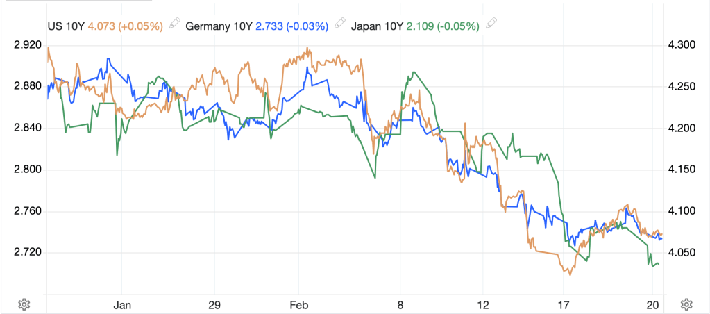Bond yields over the past month have declined, indicating that despite ongoing deficit spending, investors are seeking their perceived safety whether in Treasuries, Bunds or JGBs as per the below chart of all three.