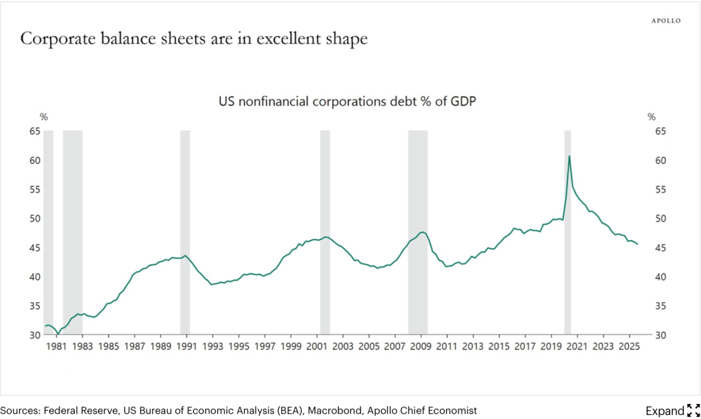 Economic data is clearly not a key driver of market movement these days, arguably because we continue to get mixed outcomes, with some things looking good (Initial Claims, Philly Fed) while others are less positive (Trade Balance, Leading Indicators), although granted, it is not clear to me what the Leading Indicators purpose is anymore. My point, though, is that we have not seen unambiguous strength or weakness across the data set for several months. This allows every pundit to frame the economic situation through their own personal lens, whether bullish or bearish. A perfect example is the dichotomy between the strength of US corporate balance sheets, as per Torsten Slok and seen below,
