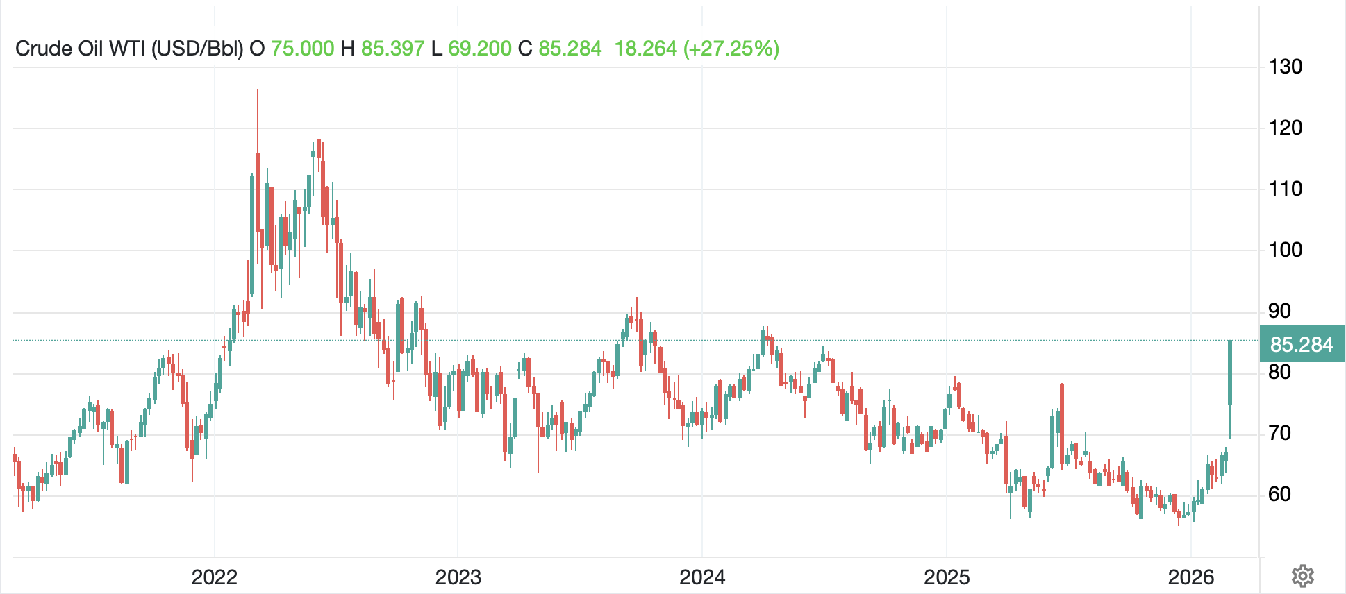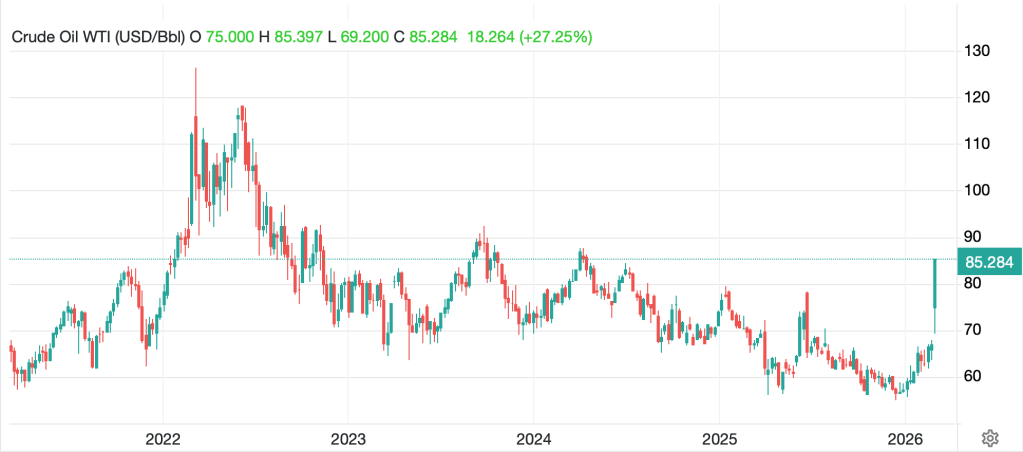 With that in mind, a look at the oil market this morning is not very optimistic as the black, sticky stuff is sharply higher once again, up by 5.25% as I type at 6:45. I have highlighted this week that thus far, the rise had not been excessive, but as we look at the chart this morning, that claim may no longer be correct. While we remain far below the levels seen shortly after Russia invaded Ukraine in 2022, the price has risen 25% this week.