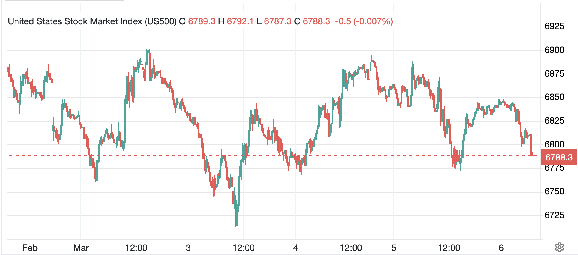 In the meantime, let’s see how markets have responded to the latest rise in oil prices. Stocks cannot make up their mind, it seems, as the below chart of the S&P 500 shows the price action over the past week, since this started.