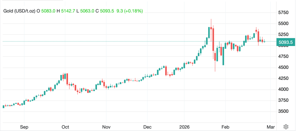 In the metals markets, both gold (+0.1%) and silver (+0.1%) are marginally higher this morning although both suffered yesterday. My friend JJ who writes the Market Vibes Substack made a very prescient statement last evening, “However, when the shit is hitting the fan, you don’t want safe assets, you want safe prices.” Thus far, gold has not proven to have safe prices, as evidenced by the daily chop you see below, but my belief remains that it will continue to maintain its value over time, especially in a situation like this.