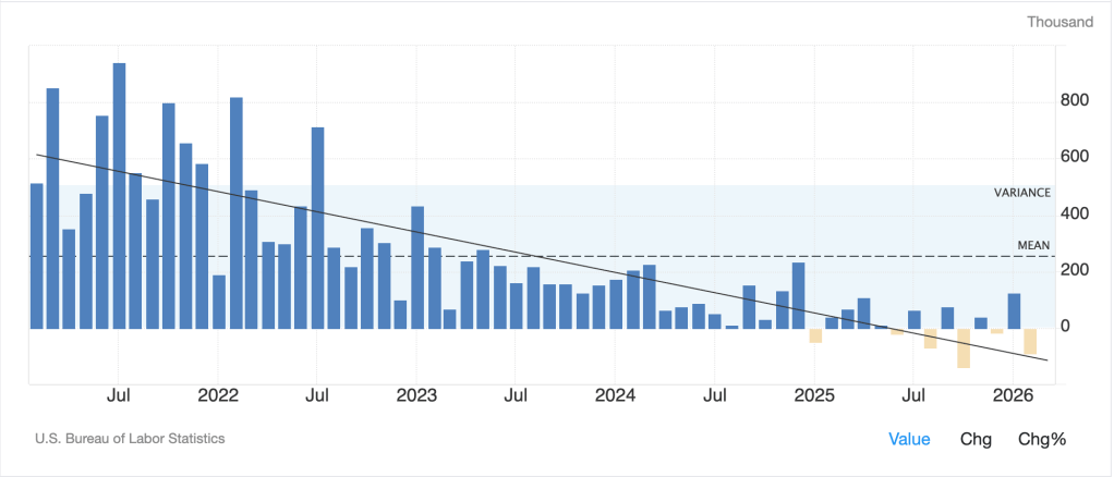 In the meantime, let’s briefly discuss Friday’s payroll report, which was pretty awful, and then see how markets are behaving this morning. By now, I am sure you have either heard or read about the NFP report which showed a headline loss of -92K, the largely offsetting January’s surprising gains. As you can see from the chart below, no matter the details of any particular report, the trend over the past five years has been clear.