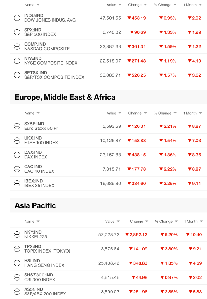 But ultimately, financial markets did not like the data Friday, as we also saw fairly weak Retail Sales data. Adding weak data to the war situation and rising oil prices led to weak equity markets in the US, and then the escalation over the weekend, saw equity markets around the world under pressure. Once again, I believe a screen shot of things this morning is self-explanatory. Those US prices are Friday’s closes.