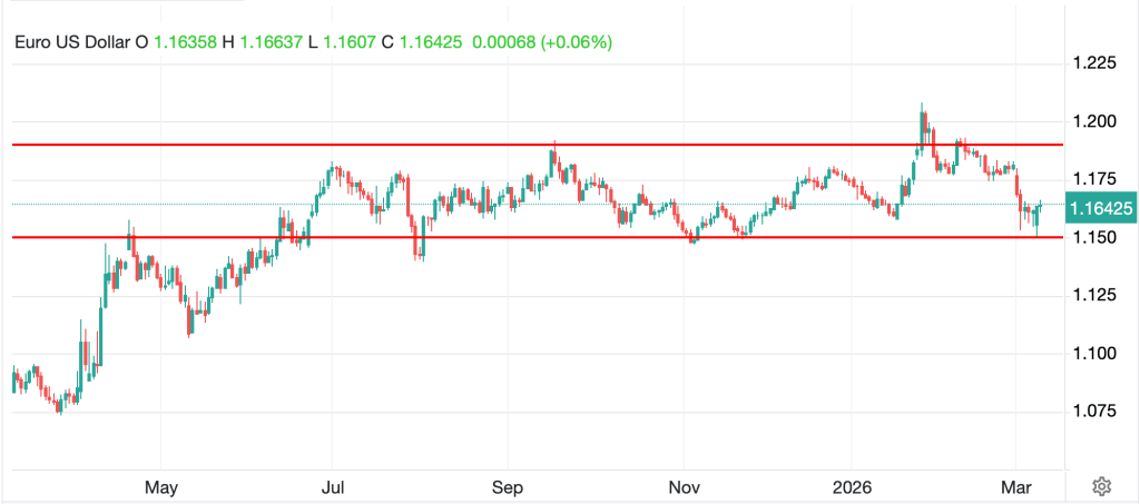 Finally, the dollar, which had significant support yesterday is giving back some of those gains as well. But let’s face it, if we take a look at the dollar over the past year vs. the euro, it has largely traded withing a 1.1500 / 1.1900 range and doesn’t appear to be making a break in either direction.