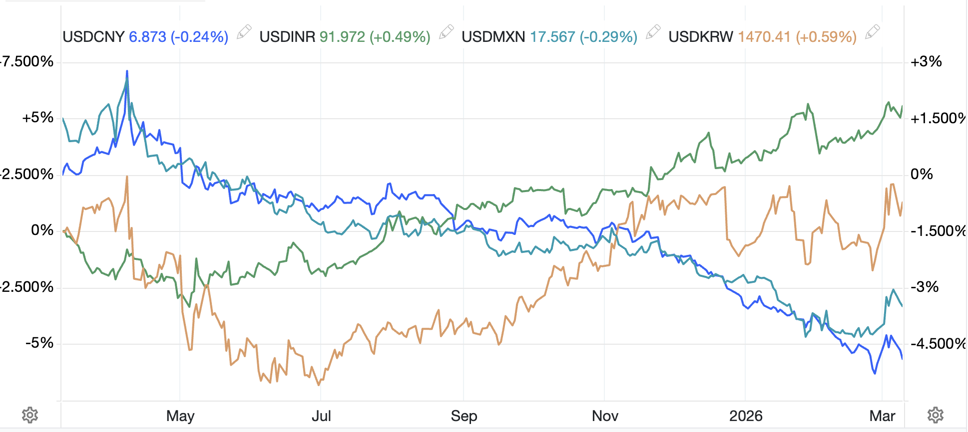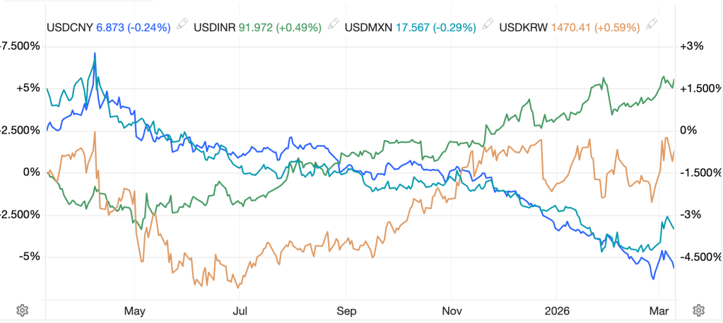 The very messy chart below shows four key EMG currencies to demonstrate that there is no trend there either. While CNY and MXN have both strengthened during the year, INR and KRW have both fallen. All I’m saying is that the idea that the dollar is either collapsing or exploding higher is simply not true. Different currencies have different drivers, and while sometimes there is a key dollar issue that impacts virtually everything, many times, you need to watch the currency in question.