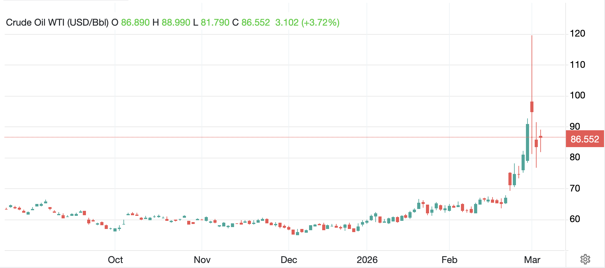 One must be impressed with the price action yesterday, if nothing else. It is a very rare occasion when the price of anything in a public market behaves like we saw oil behave yesterday. From Friday’s closing price in the futures market of $90.71/bbl, we saw a $28.70 (31.6%) rally and a subsequent $34.35 (37.9%) decline in the first 24 hours of trading.