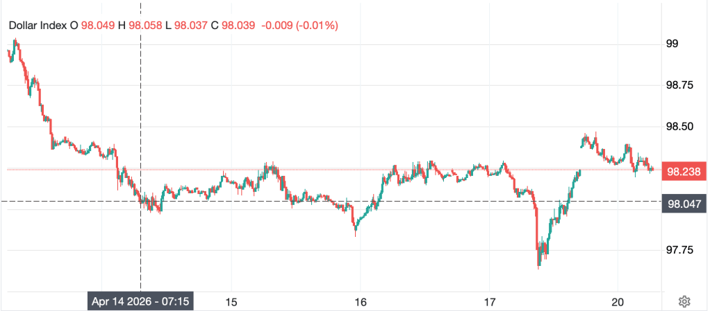 Finally, the dollar is giving back more of its war-related gains and lower across the board this morning, with G10 currencies gaining on the order of 0.3% to 0.4% across the board, while EMG currencies show similar gains with one major outlier, INR (+1.4%) easily explained by the fact that India has been the hardest hit economy from the war, and so the prospects it is ending have had a very beneficial impact on the rupee. But to be clear regarding the dollar, all we have seen is that it has moved back to the middle of its yearlong trading range between 96.50 and 100.00 based on the DXY as per the below.