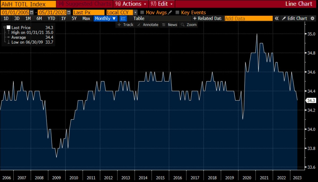 While the headline is, of course, just that, the number that will get the most press, it is worthwhile watching the Weekly Hours data which, as can be seen in the below Bloomberg chart, has been declining steadily since early 2021. The key, though, is to recognize that the only time we have been below 34.3 is during the past two recessions, so a continuation lower in the recent trend may bode ill for future economic activity. The thesis here is that companies will reduce the hours of their staff before actually firing them given the expense of bringing on and training new staff in the next up cycle.