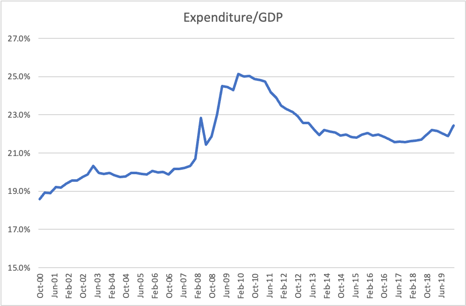 Given the current budget deficit is running > 7% of GDP and is projected to remain at least this high going forward, it is quite clear that there is a lot of nonorganic effort to raise the GDP measures. Look at the sharp upward turn at the right side of the chart. It appears that the administration will do everything they can to continue to show that the economy is strong.