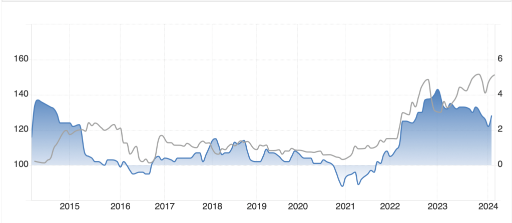His comments [emphasis added] are consistent with what we have heard from FinMin Suzuki, PM Kishida and from him previously. What makes this so interesting is that USDJPY is essentially unchanged from its level 10 days ago, immediately in the wake of the BOJ meeting. While we did touch a new yen low (dollar high) earlier this week, that level was just a single pip weaker than the level seen back in 2022 (grey line) that seemed to be the intervention trigger at the time. And consider, much has passed between then and now, with inflation in Japan (blue shaded area) having fallen back to levels last seen at that time, but now trending in the opposite direction.