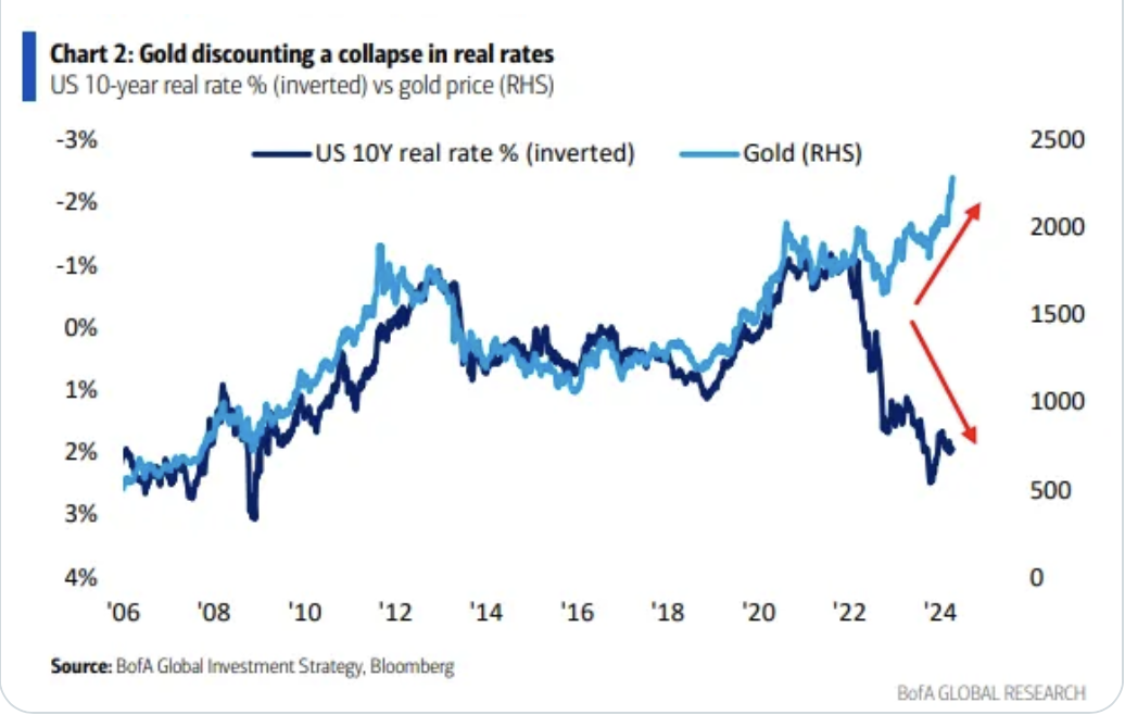 Trying to step back for a broader perspective on the economy and the future of policy rates as well as market movements, there continue to be several conundrums in markets compared to historical trends. For instance, what is the meaning of the price of gold rising consistently alongside a rise in interest rates, both nominal and real? Historically, there has been a strong negative correlation between the two, but something has changed in the past two years as evidenced by the BofA Research chart below.