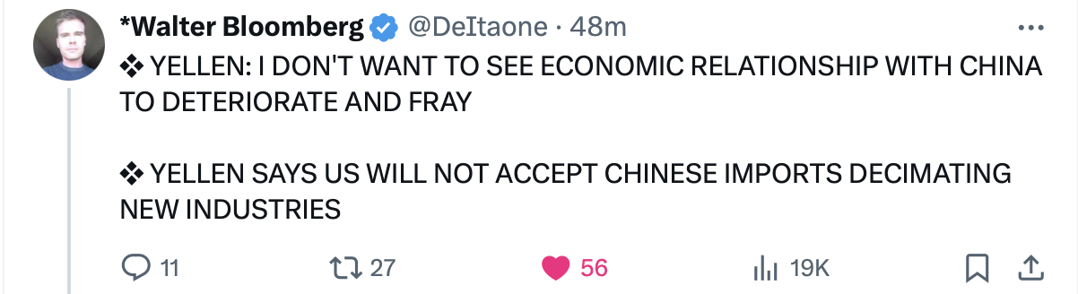 Ok, let’s look at the overnight session. After Friday’s solid US equity performance, the picture elsewhere has been slightly less positive, although positive overall. In Asia, the Nikkei (+0.9%) followed the US price action although Chinese shares had a less positive session, falling on the mainland with the HK market staying flat. Treasury Secretary Yellen was in China trying to smooth things over, but the following two statements, I think, are a great description of how confused things are: