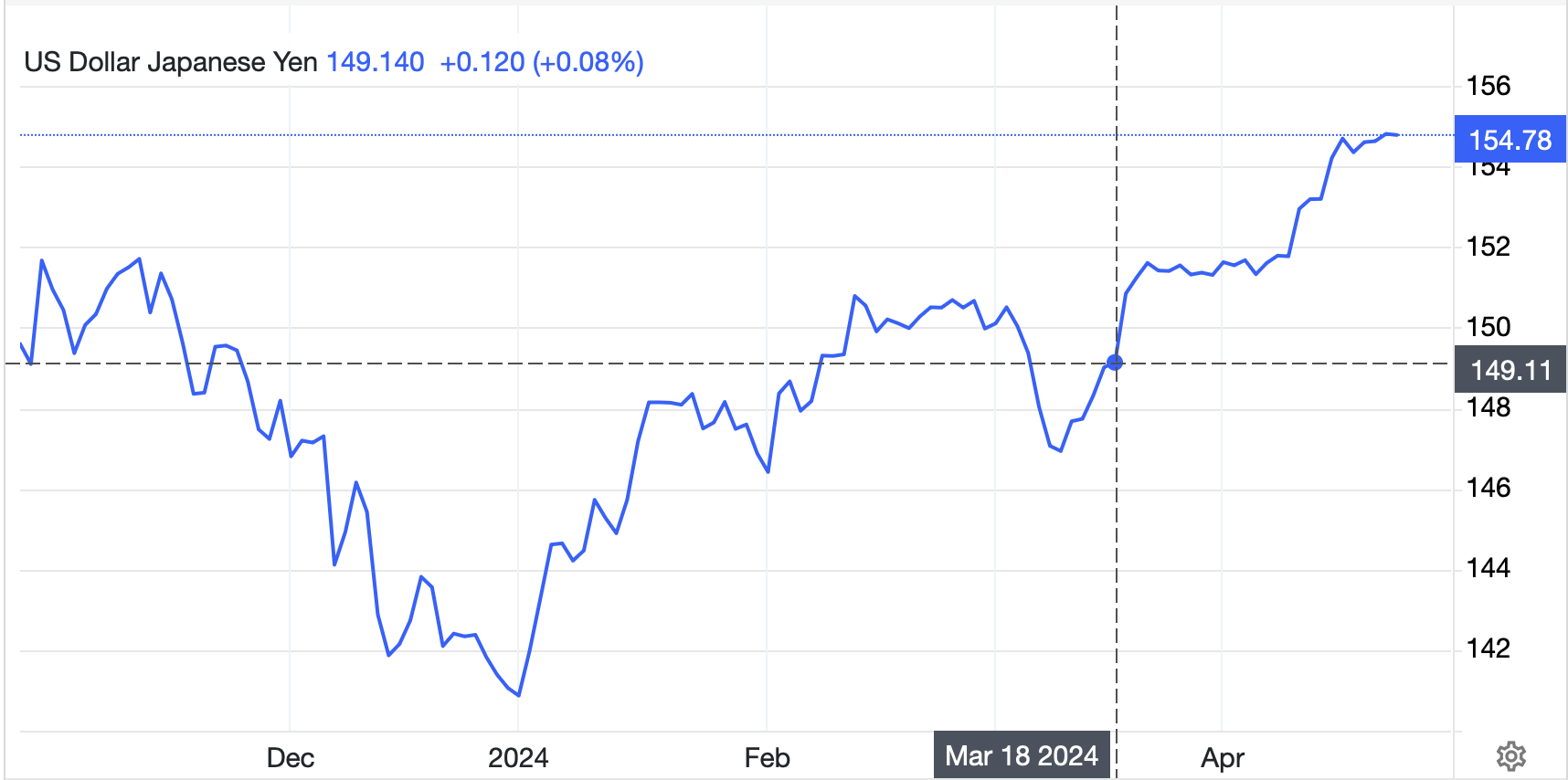 On a quiet morning after a welcome rebound in equity markets around the world, there has been an uptick in discussion regarding the yen, BOJ Governor Ueda and the upcoming BOJ meeting this Friday. One of the things that seems to have Ueda-san and the rest of the BOJ confused is that after their last meeting on March 18, where they raised interest rates for the first time in forever, the yen has continued to weaken. A quick look at the chart below shows the relatively steady decline in the currency since that date.