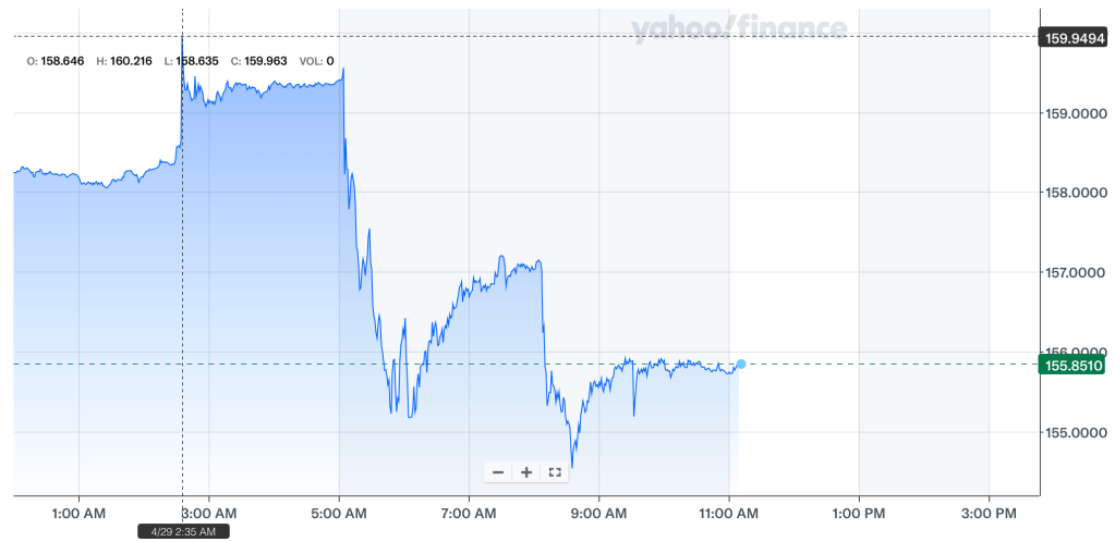 The next story of note was the fact that USDJPY trade above 160 last night, during the early hours of the session. As can be seen from the below chart from yahoo finance, it seemed to have touched 160.216 before slipping back to the mid-159’s and then collapsing a few hours later, back to its current state just below 156.