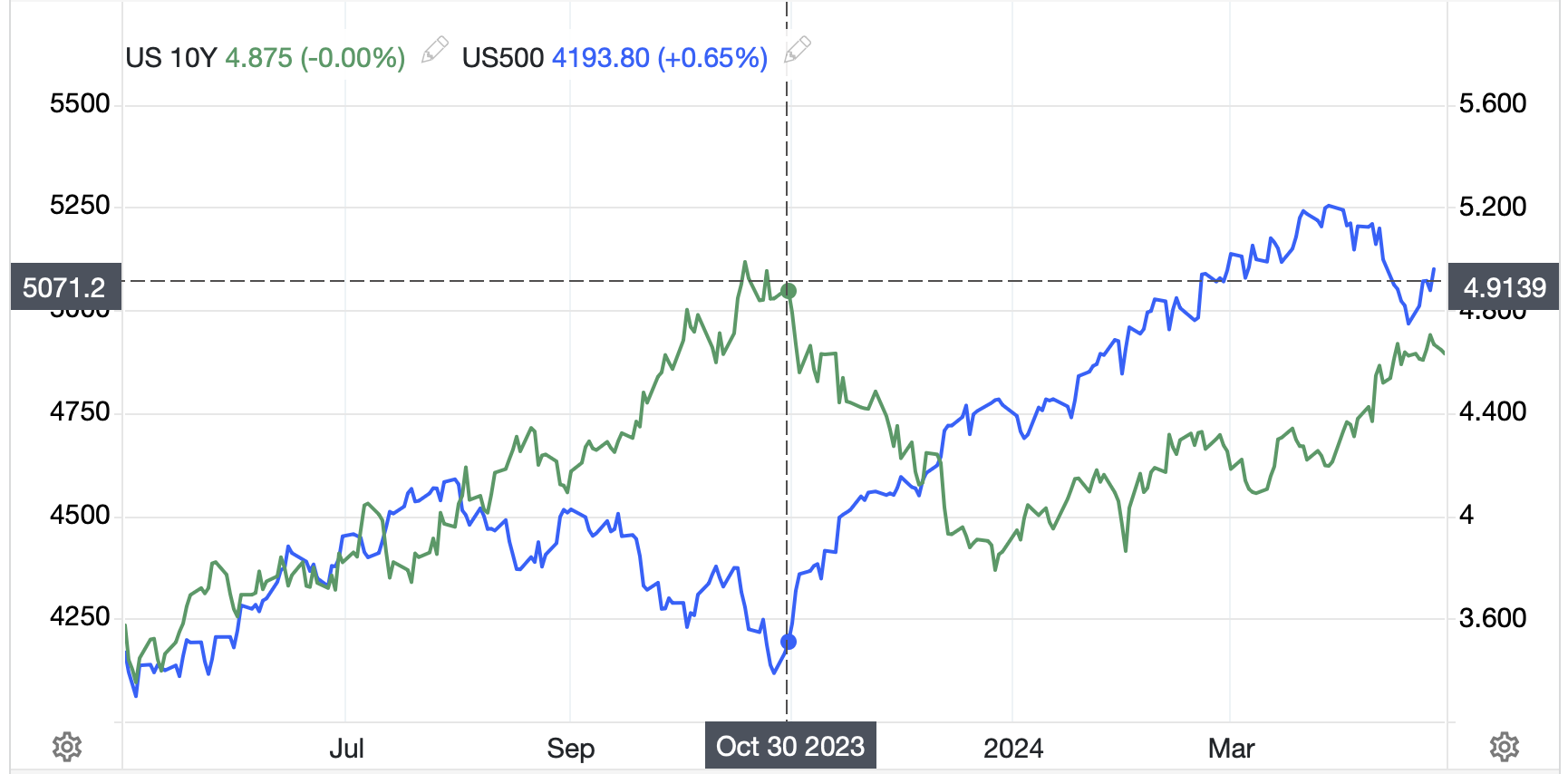 This brings us to the Quarterly Refunding Announcement (QRA) to be released at 3:00 this afternoon. While historically, the only people who cared about this report were bond market geeks, it has gained a significant amount of status since the October 31st announcement where the Treasury indicated it would be issuing less debt than had been expected. That led directly to the massive bond market rally at the end of last year as well as the concomitant stock market rally. Looking at the below chart from tradingeconomics.com, it is pretty clear when things turned around, and it was right when the QRA came about.