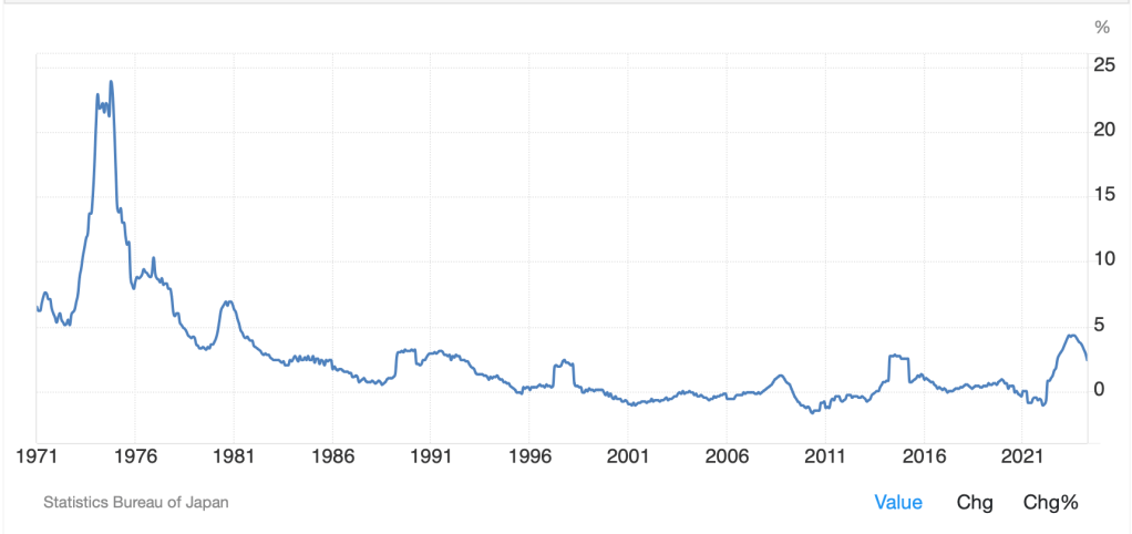 The irony here is that were this the chart of the inflation rate in any other G7 nation, the central bank would be crowing about how successful they had been at slaying the inflation dragon. Alas, as the chart demonstrates, Japan’s dragon was a different species, and one that I’m pretty sure the 122 odd million people there were very comfortable having as a “pet”. After all, I have never met a consumer who was seeking prices to rise before they bought something, have you?
