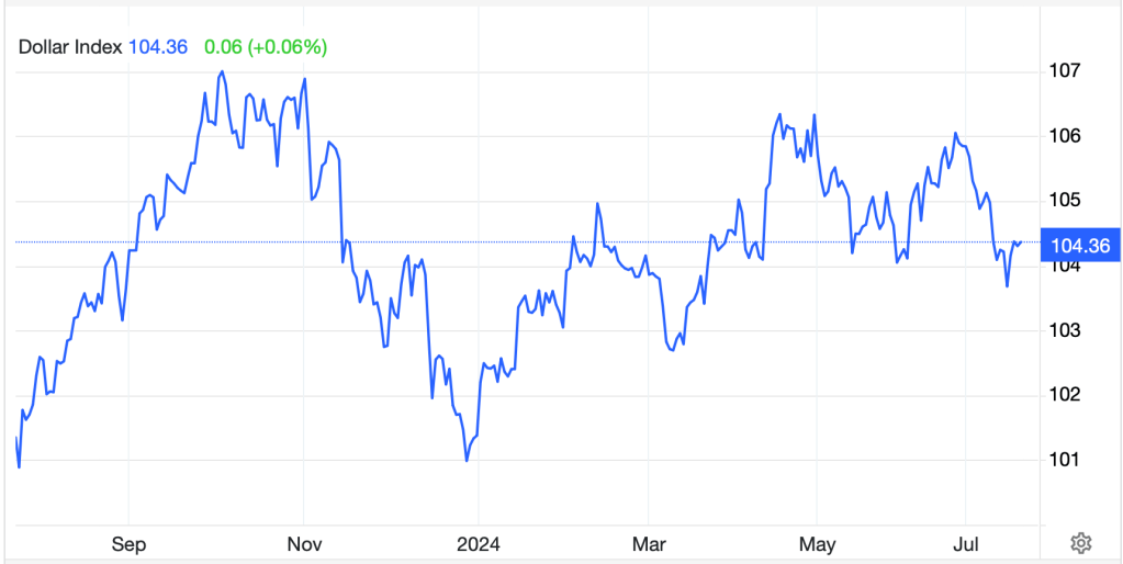Finally, the dollar, which has been written off more times than I can count, is firmer again, back above 104.00 on the DXY. For all the discussion about how the dollar is set to decline, a quick look at the DXY over the past year tells me that there is no discernible downtrend at all (nor is there an uptrend).