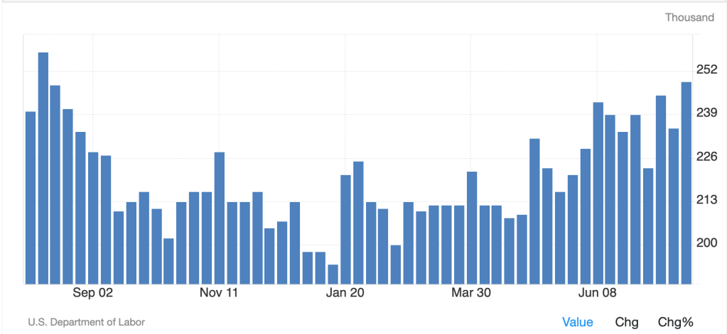 Which takes us to this morning’s payroll report. Before that discussion though, it is important to touch on what yesterday’s data revealed. It started with the highest Initial Claims data in almost a year, far higher than forecast and as you can see in the chart below, there certainly seems to be a developing trend.
