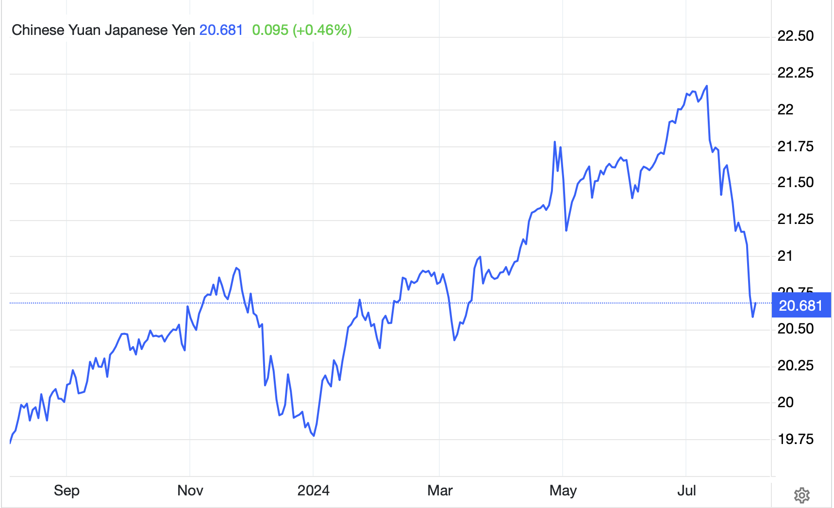 Lastly, the dollar is under real pressure this morning, opposite its haven characteristics but for a good reason. A quick look at the CME futures shows the market is now pricing a 24% chance of a 50bp cut in September, and if the data continues to weaken, especially this morning’s NFP, I expect there will be pressure growing for an inter-meeting cut. So, the euro (+0.4%) looks healthy by comparison and USDJPY continues to trickle lower, but the big surprise is CNY (+0.55%) which has had its largest daily rally since early May. I maintain that the PBOC will be happy to allow the renminbi to strength as long as it lags the yen. And lately, every currency has been lagging the yen with the big carry trades amongst the worst performers. But the chart of CNYJPY below demonstrates that the PBOC is likely not that concerned about a little strength vs. the dollar right now.