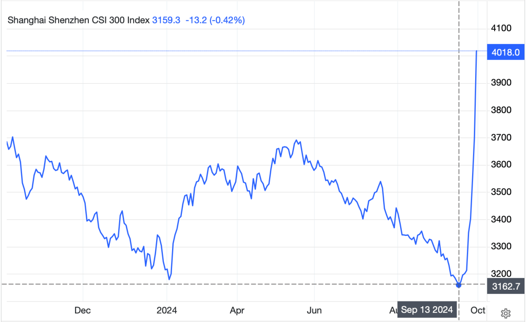 So, to recap what China has done in the past week, they have cut interest rates across the board, guaranteed loans to be used for stock repurchases, changed regulations to allow lower down payments on mortgages for first and second homes and now allowed more aggressive refinancing of existing mortgages. As well, they reduced the RRR, freeing up capital for banks, and relaxed rules for regional governments to be able to spend more. Now matter how this ultimately ends up, you must give Xi full marks for finally figuring out that in a command economy, he needed to command some more stimulus. The latest mortgage news has simply excited the equity market even more and there was another huge rally last night (CSI 300 +8.5%), which when looking at a chart of that index shows an impressive rally in the past two weeks, slightly more than 27%!