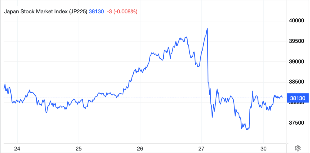 Of course, USDJPY was able to respond instantly, hence the sharp reversal in the market I showed in a chart on Friday. However, the futures market sold off sharply on the election news and now that has been reflected in the overnight session with the Nikkei (-4.8%) giving back all the gains it had made in the previous two sessions in anticipation of a dovish turn. So, as you can see in the below chart for the Nikkei 225 over the past week, we are basically exactly where things started before the Takaichi expectations built. Truly much ado about nothing.