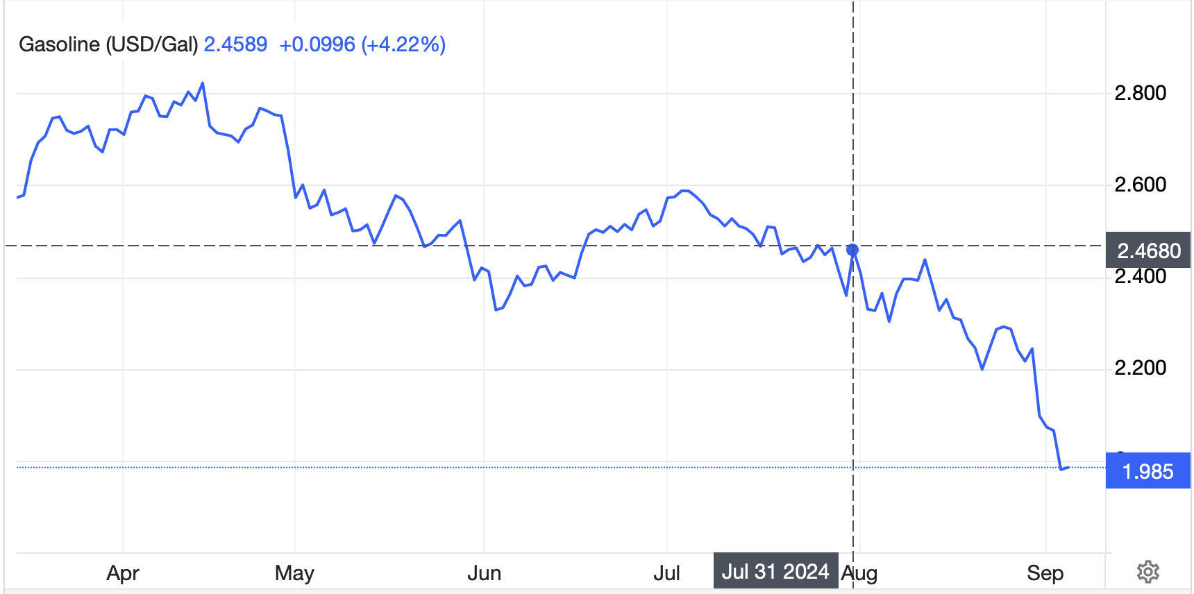 To this poet’s eyes, the big picture remains that economic activity is continuing to slow down around the world, and that price pressures in the US are lagging that decline. It appears that China is flooding the global markets with manufactured goods as domestic consumption there remains lackluster, thus goods price inflation remains under control. However, there is no sign that central banks or governments are reducing the amount of available liquidity which is finding its way into services pricing, and that is a much larger part of the economy, hence likely to sustain inflation readings going forward. I’m confident the Fed will cut rates in 2 weeks’ time, but I’m also highly concerned that the result will be inflation remaining higher than ‘target’ going forward. The one thing on Powell’s side right now is the decline in oil, and by extension gasoline (see chart below where gasoline futures fell >15% in August), prices, which will help push headline numbers lower.