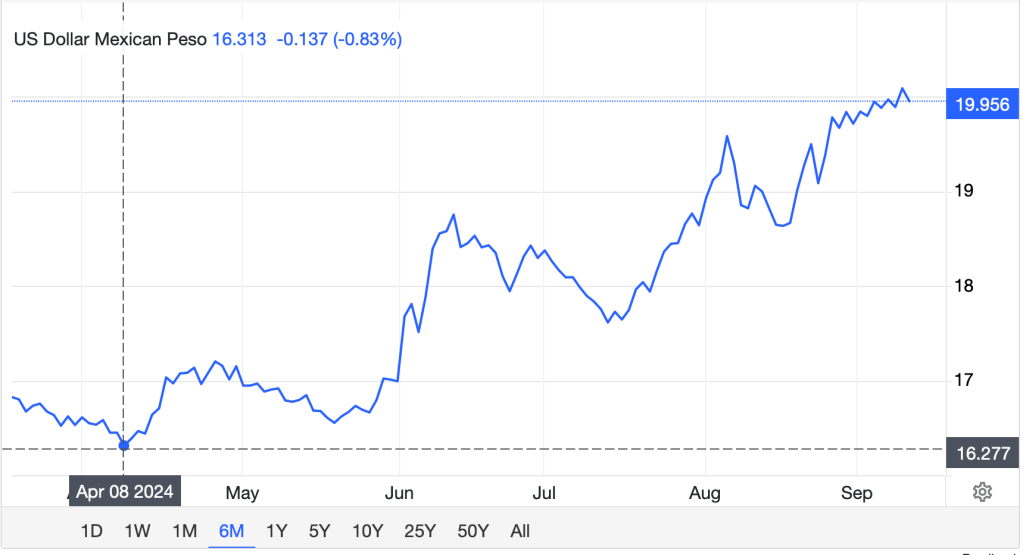 The other political story of note was that in Mexico, AMLO, who remains president for a few more weeks, was able to finally get the change to the constitution he has been seeking his entire term, which now allows for judges, including supreme court justices there, to be elected rather than appointed.  The concern is that this will politicize the judicial system.  An independent judiciary is a key ingredient for international investors as they seek some comfort that business decisions can be fairly considered.  However, judicial elections may call that into question and that is likely to have a longer-term negative impact on the Mexican economy.  As you can see from the chart below, the peso has been massively underperforming since April, falling more than 22% and breaching the 20.00 peso level for the first time in more than 2 years, as concerns over this issue have grown.  Add to this the fact that inflation in Mexico has drifted slowly lower and expectations are rising for more aggressive rate cuts by Banxico, and you have the recipe for a weaker currency.  While the peso has bounced 0.9% this morning, this trend lower remains clear for now.