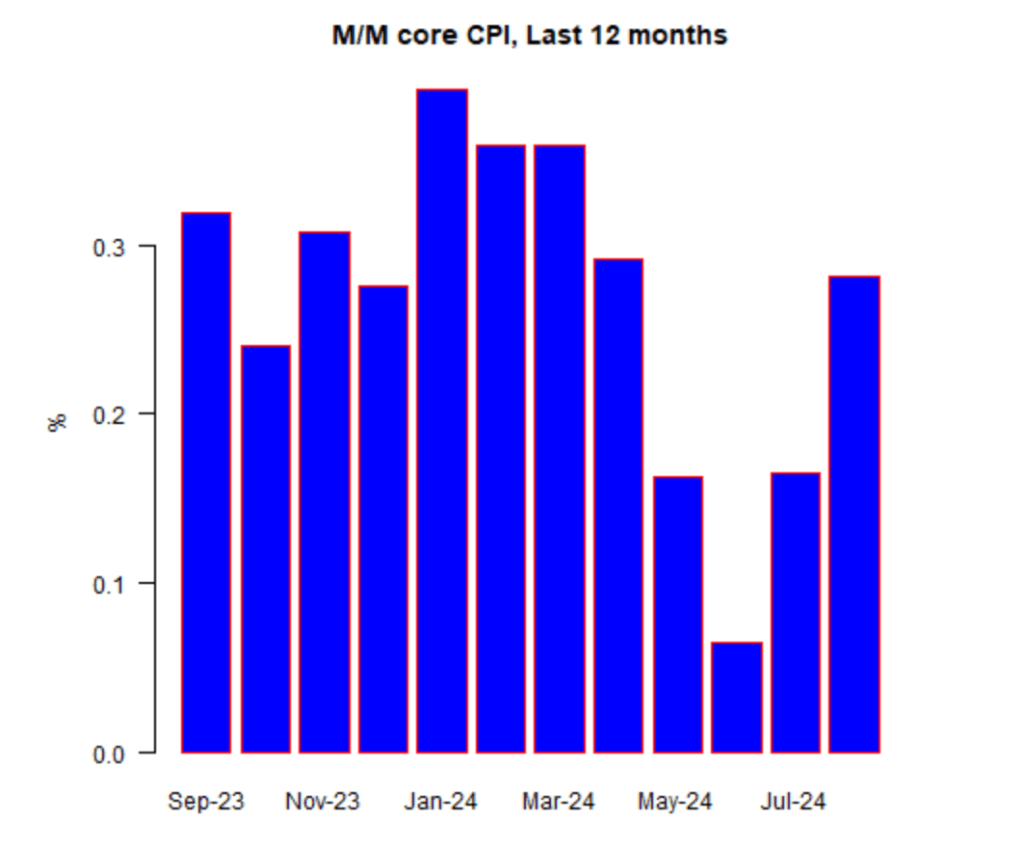 I guess if you squint just the right way, the trend in inflation remains lower. I only guess that because that’s what we heard from three Fed speakers yesterday, Williams, Goolsbee and Barkin, but to my non-PhD trained eye, it doesn’t really look that way. Borrowing the chart from my friend @inflation_guy, Mike Ashton, below are the monthly readings for the past twelve months for Core CPI.