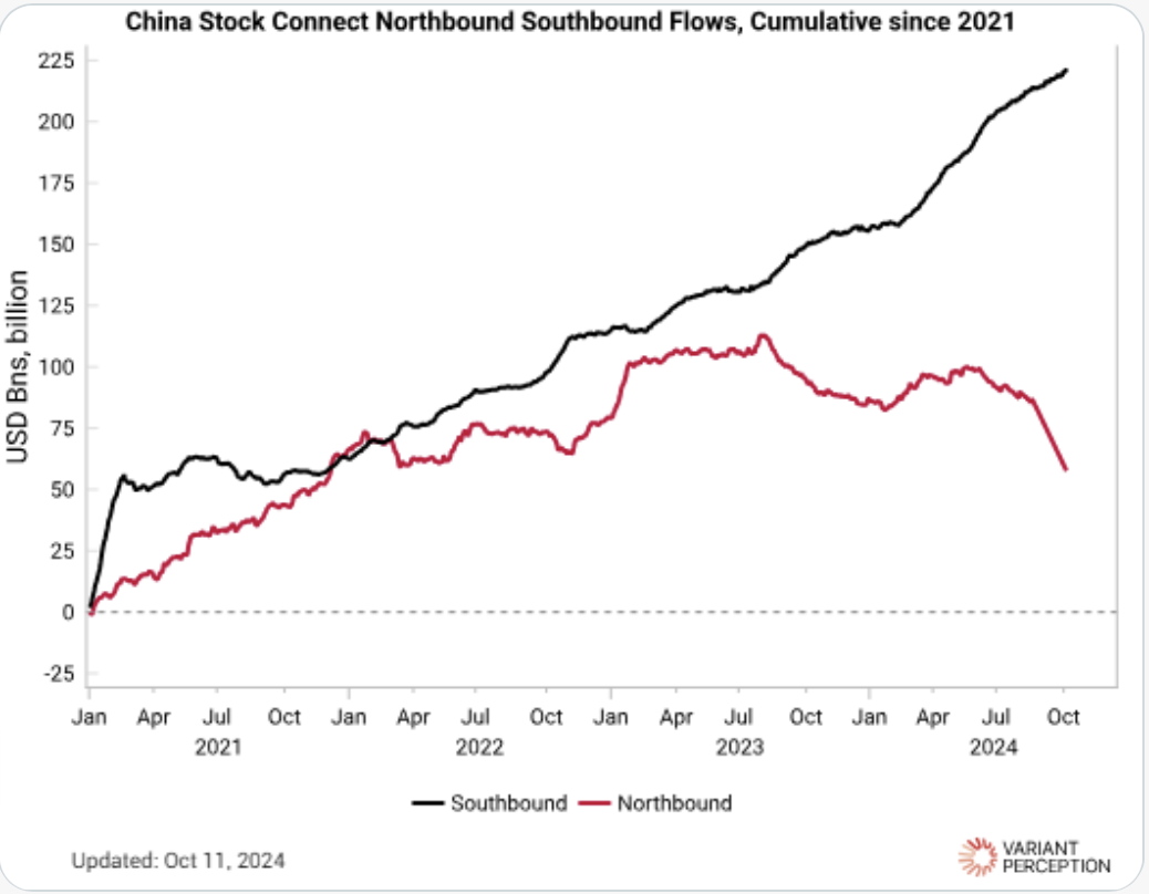 That said, Chinese stocks have become one of the hottest themes in the market with many analysts claiming they are vastly undervalued relative to US stocks. However, I saw a telling chart this morning on X, showing that flows into Chinese stocks from outside the nation, the so-called northbound flows from Hong Kong, especially when compared to flows from the mainland to Hong Kong, have been awful, despite this recent rally. As with many things regarding the Chinese economy and markets, the headlines can be deceiving at times in an effort to make things look better than they are.