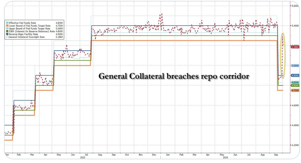 In the bond market, yields continue to edge higher with Treasuries gaining 3bps and European sovereigns all looking at gains of between 3bps and 5bps. An interesting interest rate phenomenon that has not gotten much press is that the fact that at the end of September, the General Collateral Repo rate surged through the upper bound of the Fed funds rate, a condition that describes a potential dearth of liquidity in the markets.