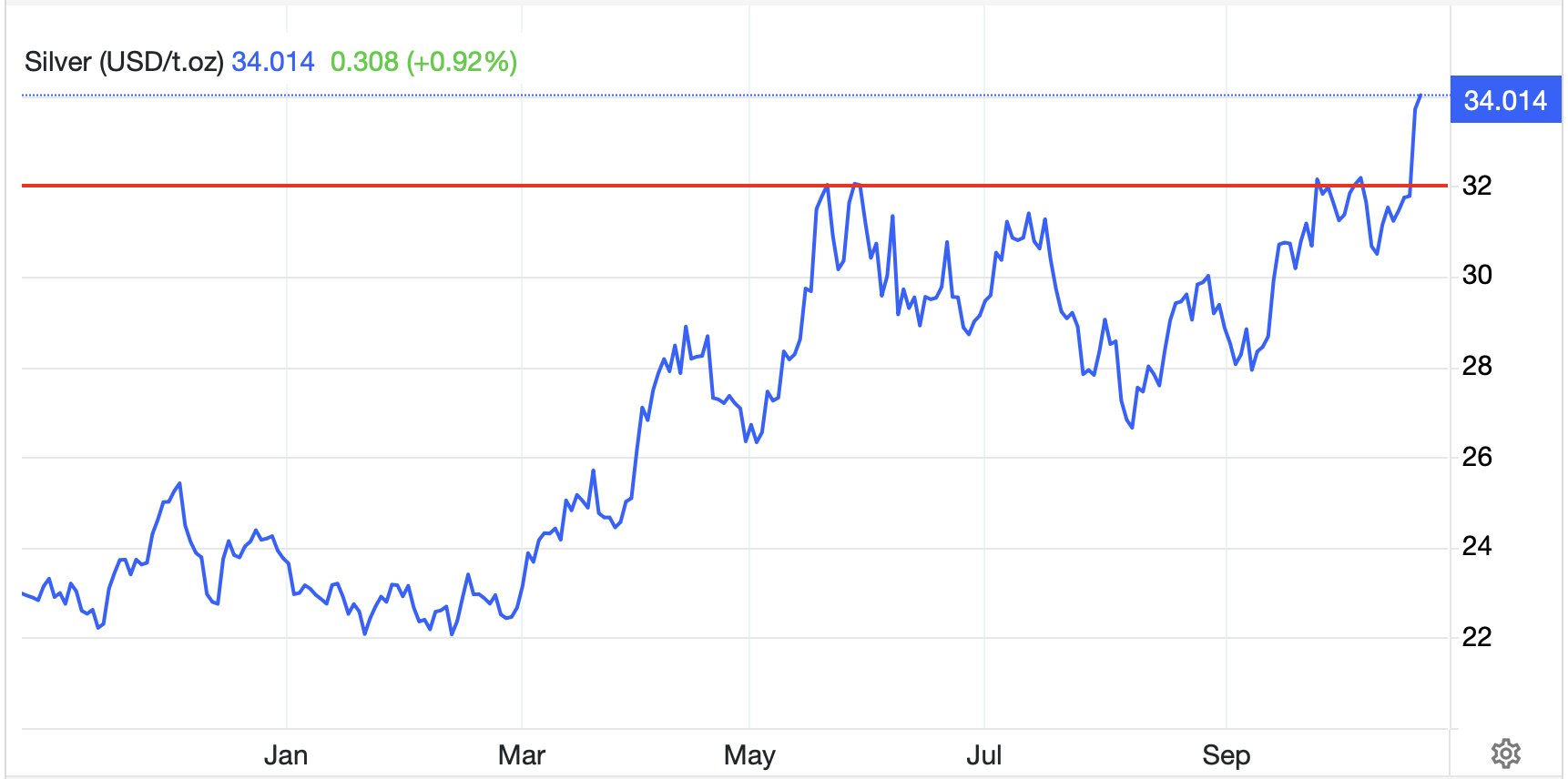 Arguably, the biggest story in markets continues to be the commodities space, specifically metals markets, as once again, and despite today’s dollar strength, we see gold (+0.5%), silver (+1.0%) and copper (+1.1%) rallying with the barbarous relic making yet another set of new all-time highs while silver has broken above a key technical resistance level at $32.00/oz as seen in the chart below.