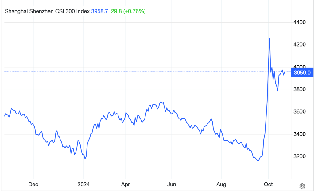 So, with that in mind, let’s take a look at what happened overnight.  Yesterday’s mixed US session, with the DJIA slipping while the other major indices rallied a bit, led to a mixed picture in Asia as well.  Japanese shares (-0.6%) suffered a bit as Japan, too, is heading toward a general election and questions about whether new PM Ishiba will be able to win a majority in the Diet are very real this time.  Apparently, even in a homogenous society like Japan, there are questions about the ruling party and how much it is focused on helping the population.  As to the rest of Asia, both China (+0.7%) and Hong Kong (+0.5%) managed modest gains, but there are still many questions as to exactly how much stimulus China is going to inject into the economy there.  In fact, you can see the market asking those questions by the chart below, where the spike was the initial euphoria that something was going to be done, and the retracement is the realization that it was hope and not policy that drove things.