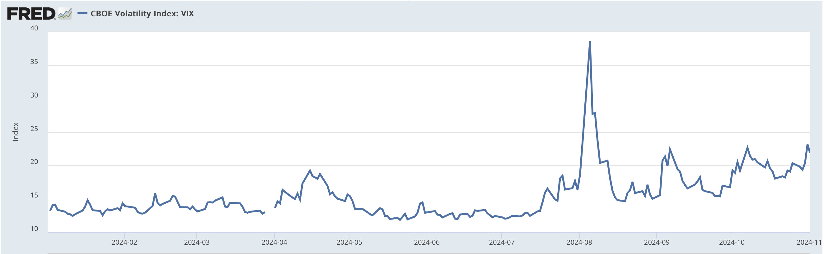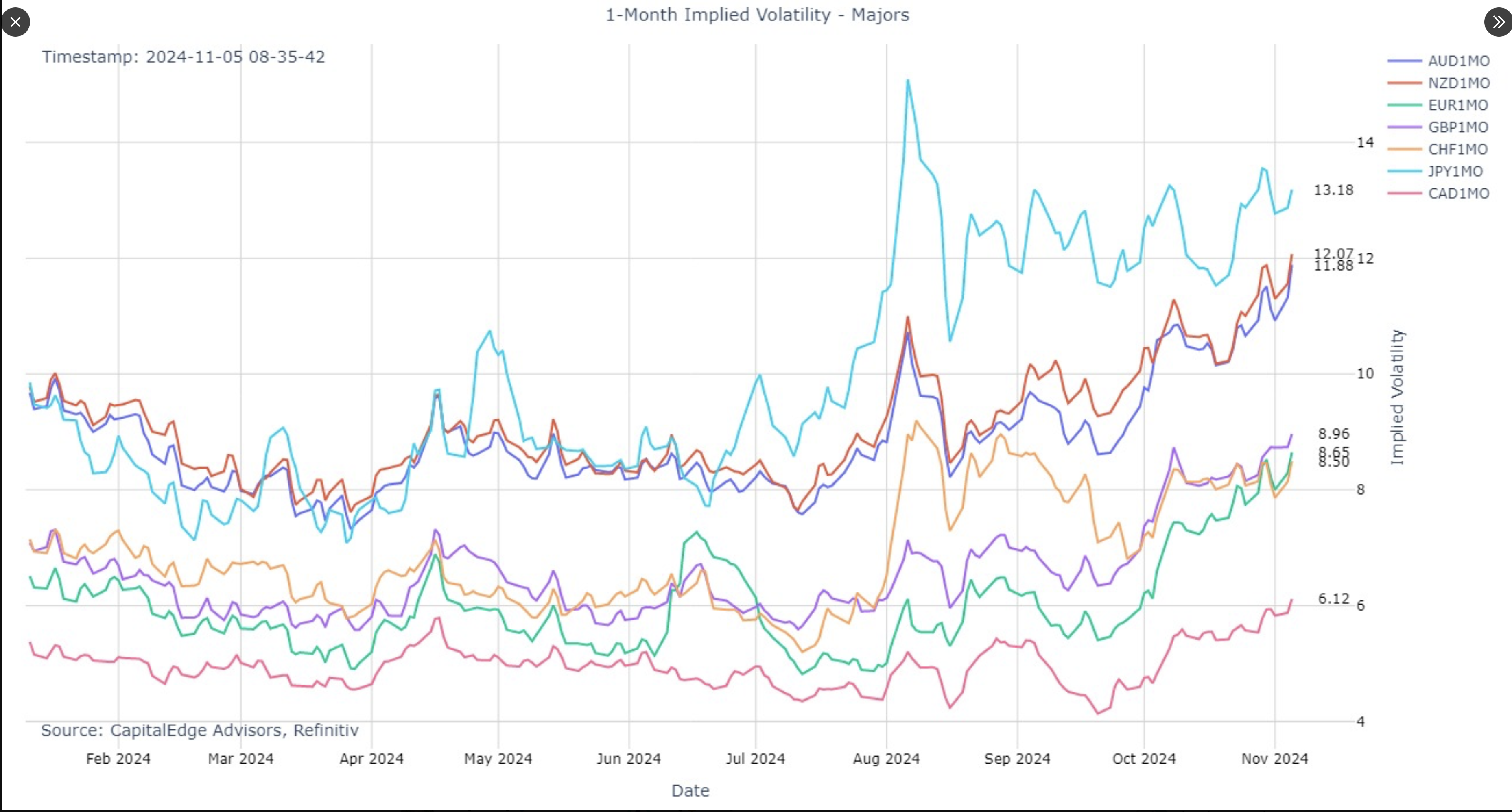 They have been rising steadily since early October as a combination of corporate hedgers trying to protect themselves and hedge funds and traders trying to profit from the dislocation have increased demand steadily. The one truism here is that upon confirmation of a winner, regardless of the underlying move in the dollar, implied volatility is going to decline.