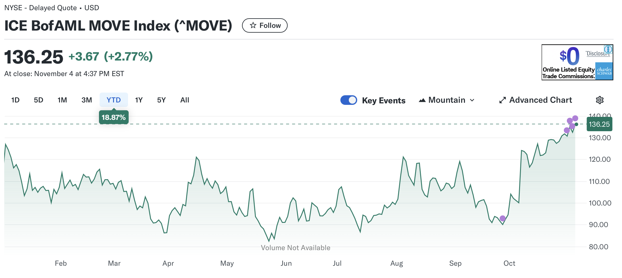 Finally, the MOVE Index, which is the bond market volatility index shows very similar behavior, a steady climb over the past month especially, but truly trending higher since the summer as seen below: