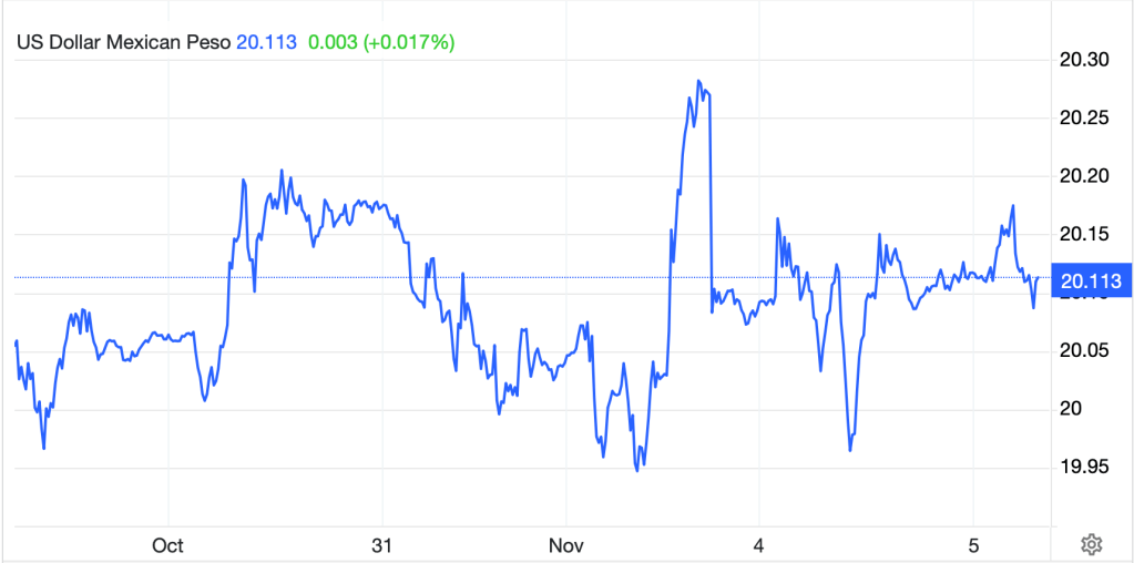 And that’s really it this morning. We see the Trade Balance (exp -$84.1B) and ISM Services (53.8) but honestly, nobody is going to respond to that data. Instead, all eyes will be on the early exit polls and the reporting of how the election is going. No matter what, it seems hard to believe we will really have an idea before 10:00pm this evening, and then only if it is a blowout in either direction, seemingly a low probability. So, today is a day to watch and wait if you don’t already have hedges in place because honestly, it’s probably too late to do anything now.