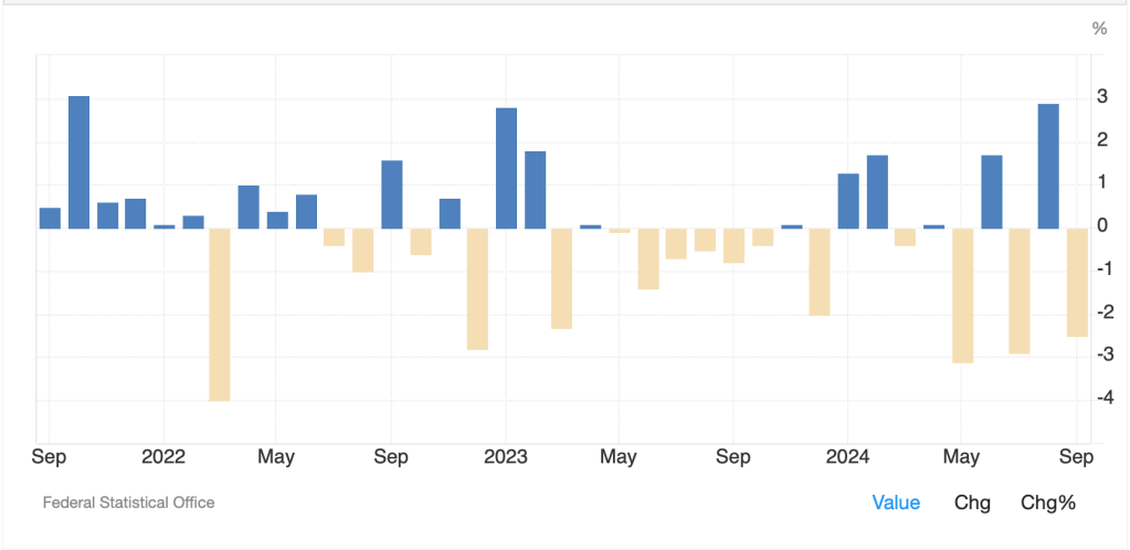 So, where do we go from here? That, of course, is the $64 billion question. Reactions around the world are still coming in and I would characterize them as a mix of stoicism and fear. Perhaps a good place to start is Germany where the governing coalition just collapsed as Chancellor Sholz fired the FinMin who was the head of the FDP, one of his coalition’s groups. Their problem is that the German economic model is crumbling, and the population is unhappy with the current situation. The former can be demonstrated by today’s data showing the Trade Surplus fell more than expected while IP fell back into negative territory again, an all-too-common occurrence over the past three years as can be seen below, and hardly the best way to improve the productivity of your economy.