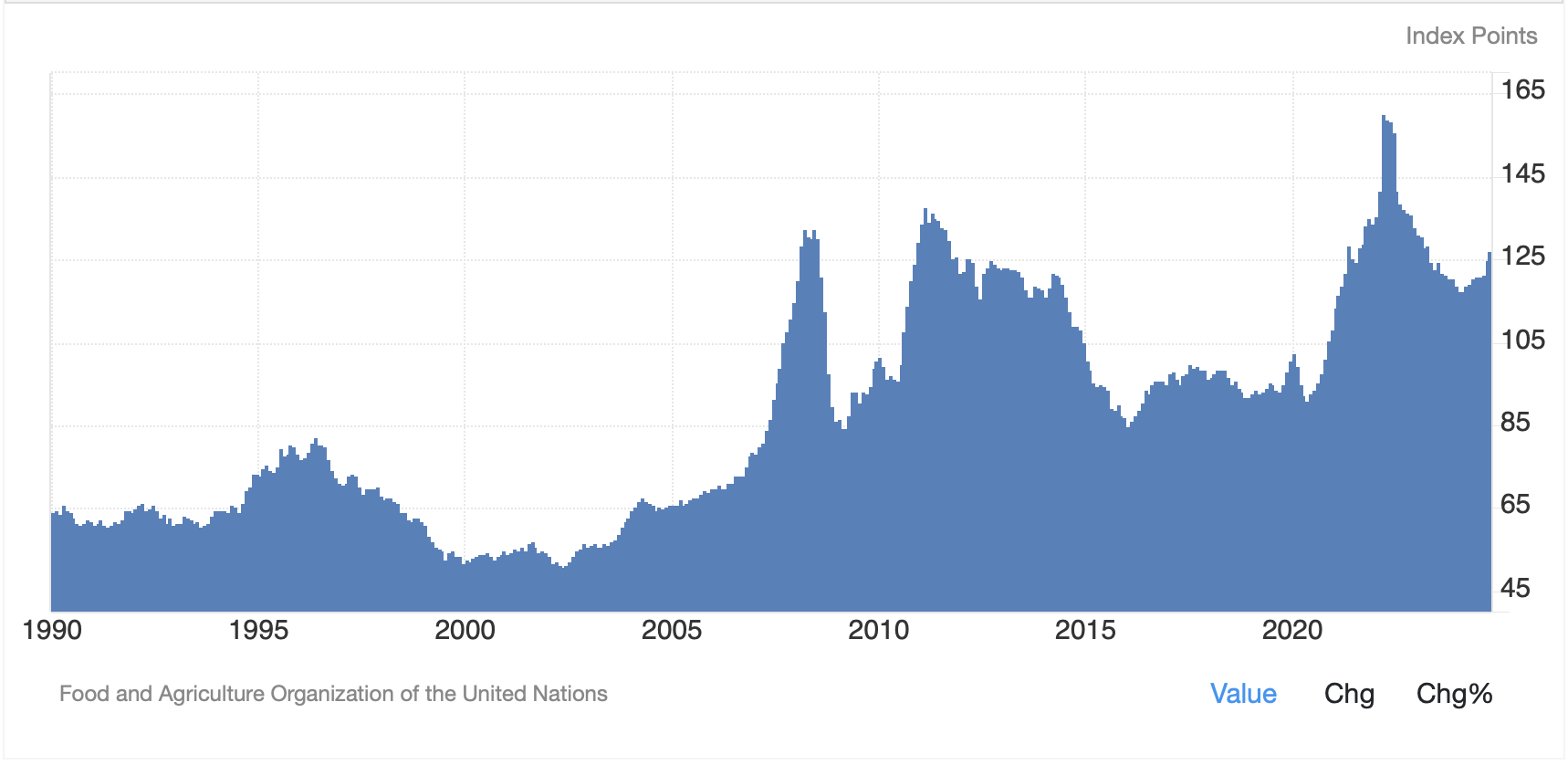 On the data front, Michigan Sentiment (exp 71.0) is all we get this morning although we also get our first Fed speaker, Governor Bowman, who has been one of the more hawkish voices. One other thing to note is that the FAO’s Food Price Index was released this morning, climbing 2% to 127.4. as you can see from the chart below, while this is not as high as prices reached in the immediate aftermath of the Russian invasion of Ukraine, this level is still in the upper echelons of where things have been over the past thirty-four years.