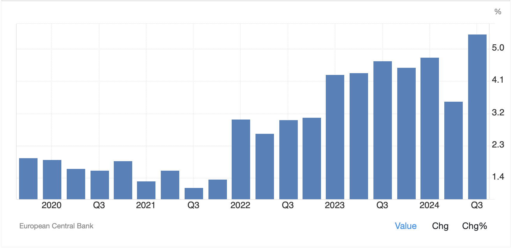 But, whatever the history, that is the goal and recent data from countries throughout the G10 show that prices are not really converging to this rate. The UK is the latest to release data with the Headline CPI rising 2.3%, a tick more than expected and Core rose 3.3%, 2 ticks more than expected. It seems that the same problems the Fed is having with services ex-shelter are being felt in many places around the world. This is the portion of the CPI basket that is most directly impacted by wages and wages continue to rise (which is a good thing for most people), just not necessarily quickly enough to keep up with inflation. For example, Eurozone Negotiated Wage Growth rose 5.42% in Q3, its fastest rise since the Eurozone was formally created as per the chart below. It strikes me that the ECB is going to find it very difficult to push prices lower absent causing a deep enough recession where layoffs are widespread, and wages fall. And my guess is that is not one of their goals.
