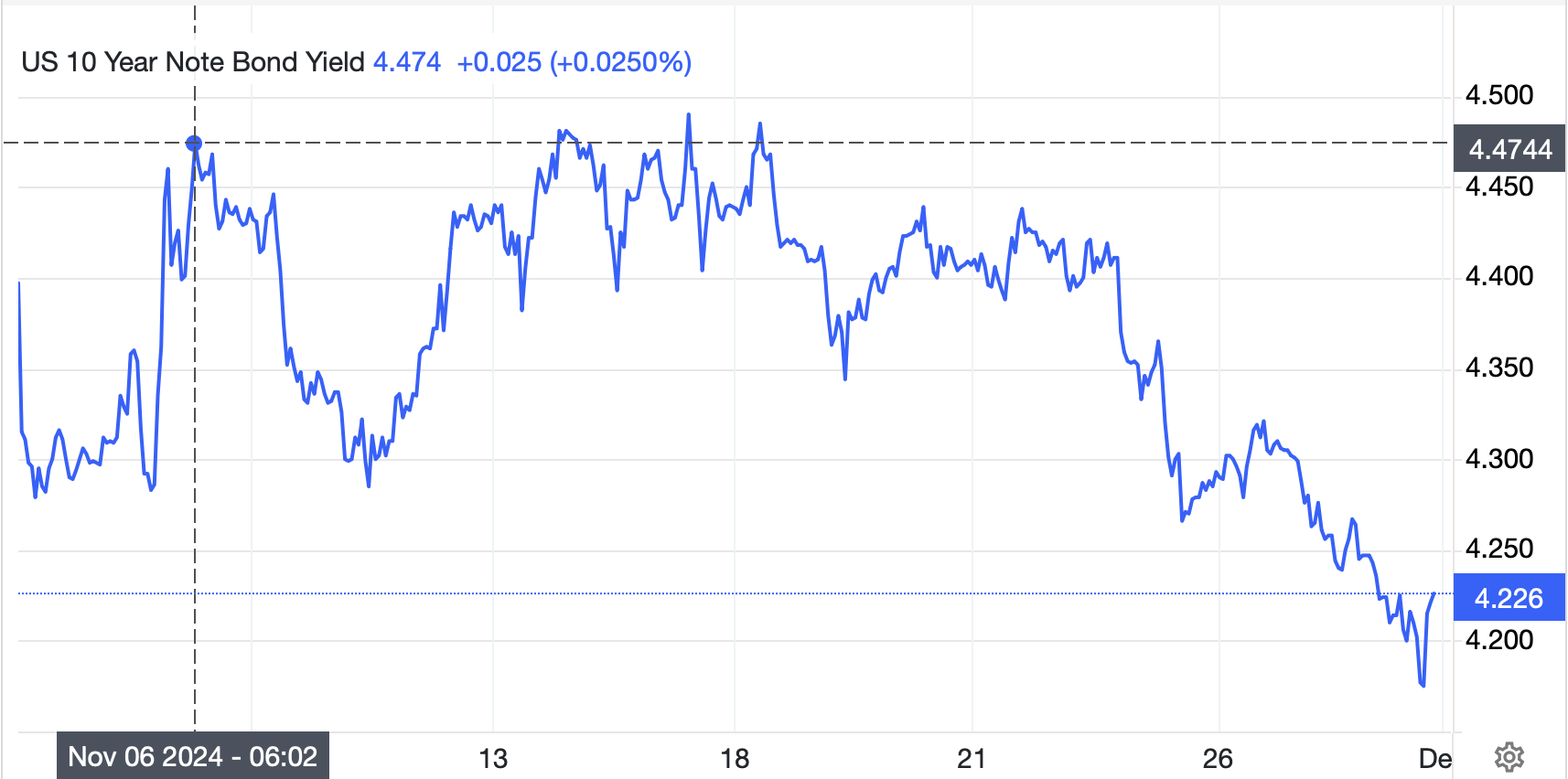 But, over time, it would not be surprising to see Trump lean effectively on the Fed to reduce policy rates (remember, he was quite upset the Fed never went negative). As well, if there is any success in the DOGE project, with significant reductions in spending and deficits, that seems likely to alleviate some of the concerns over the US fiscal stance. After all, if debt grows more slowly than the nominal pace of the economy, it remains quite manageable and should help remove some of the current hysteria. In fact, a look at the 10-year yield over the past month (see chart below) shows that it has fallen 25bps (although they are 4bps higher this morning) and may well be signaling a market that is willing to give DOGE a chance. If that is the case, it seems quite possible that the dollar will eventually start to recede from its current loftier levels.