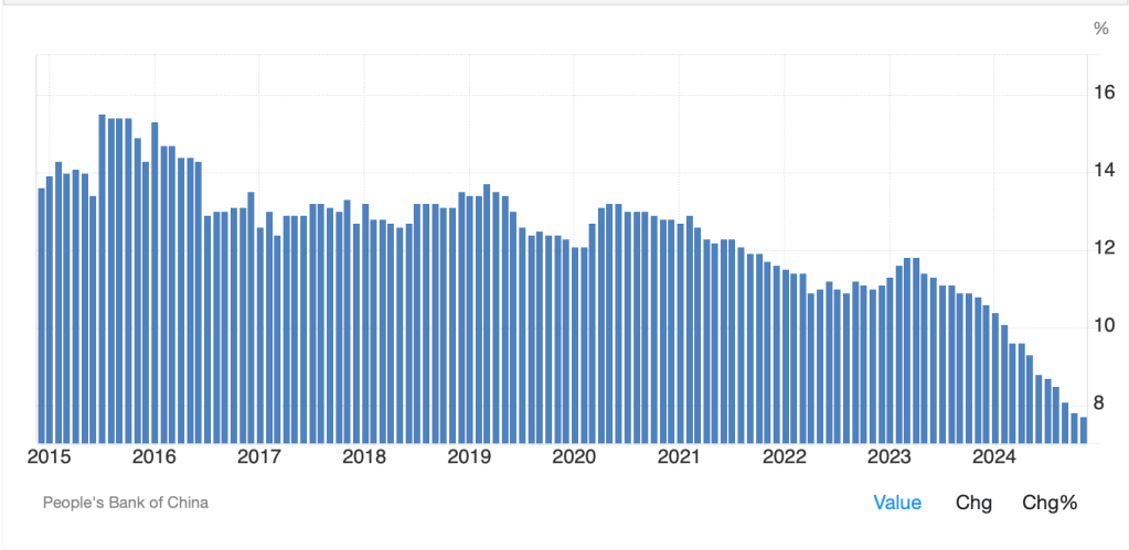 Under the guise, a picture is worth 1000 words, a quick look at the below chart from tradingeconomics.com which shows the trajectory of outstanding Yuan Loan Growth over the past 10 years is pretty descriptive. Banks in China have lost their ability to help the government implement monetary policy so the government is going to simply do it themselves. The “moderately loose” policy the Politburo announced seems likely to go beyond moderate as 2025 progresses, at least in this poet’s eyes.