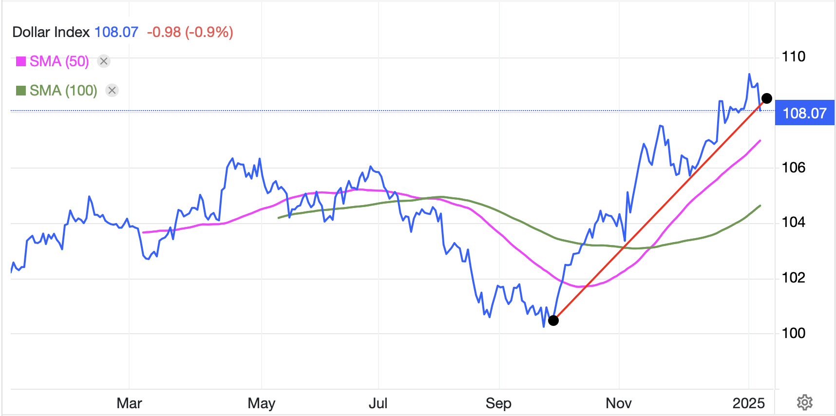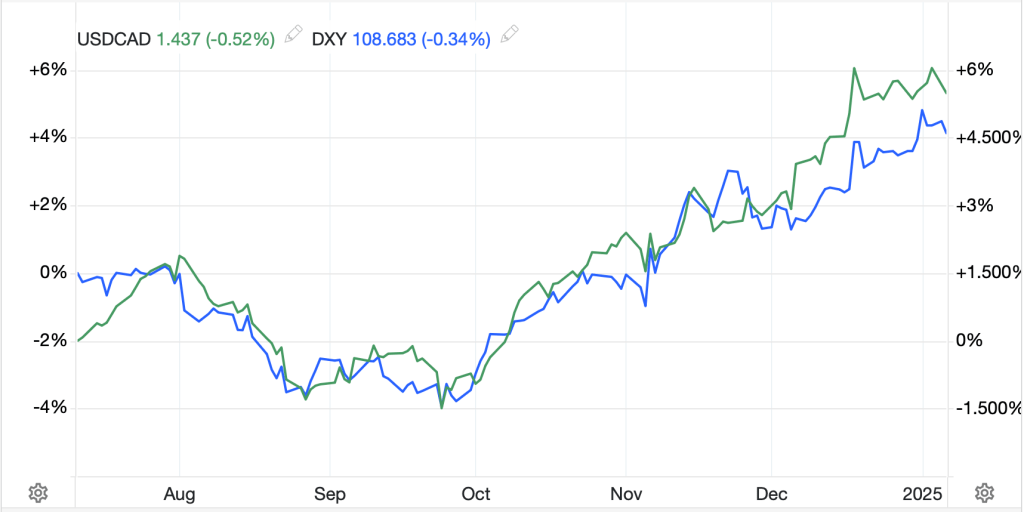 Now, we all know the dollar has been strong in its own right lately, and I suspect that while there will be bumps along the road, it will get stronger still over the year absent some major Fed rate cutting. As such, USDCAD is higher along with everything else. However, you can see in the chart below (the green line rising faster than the blue line since December) that it has been an underperformer for the past month, since that Freeland resignation, as investors have been shying away from Canada, given the combination of concerns over the incoming Trump administration imposing tariffs and no political leadership to address these issues.