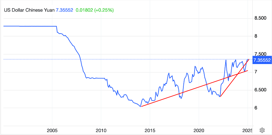 I raise these points in the context of the Chinese renminbi and how we might expect it to behave going forward. The question of tariffs remains open at this stage, although I daresay we will learn more next week. If they are imposed, there is a strong belief that the renminbi will weaken to offset the terms. As it is, the currency remains within pips of its weakest level in 18 years and the trend, both short-term and for the past decade, has been for it to weaken further.