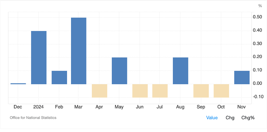 The BOE is currently meeting, and expectations are nearly universal that they will cut their base rate by 25bps to 4.50% with 8 of the 9 MPC members set to vote that way. The only hawk on the committee, Catherine Mann, is expected to vote for no change. The problem they have (well the problem regarding monetary policy, there are many problems extant in the UK right now) is that core inflation continues to run above 3.0% while GDP is growing at approximately 0.0% in recent quarters and at 1.0% in the past year. A quick look at the monthly GDP readings below shows that things have not been moving along very well, certainly not since PM Starmer’s election in July.