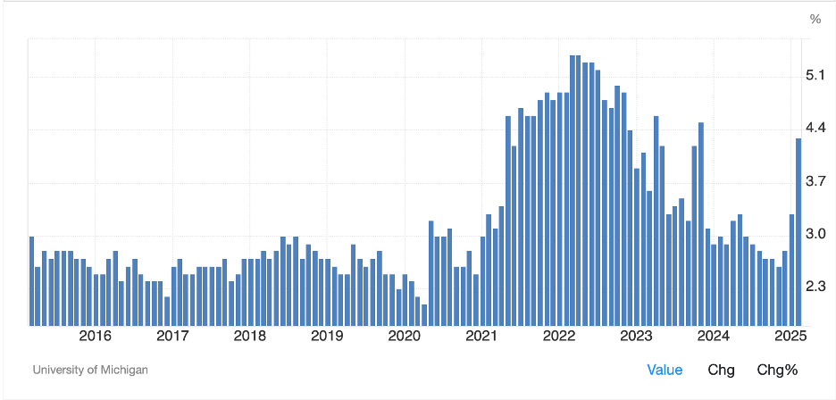 However, let’s examine the highlighted comment above a little more closely. Two things belie that statement as wishful thinking rather than an accurate representation of the current situation. The first is that the most recent survey released from Friday’s Michigan Sentiment surveys, shows that inflation expectations for the next year jumped dramatically, one full percent to 4.3% as per the below chart.