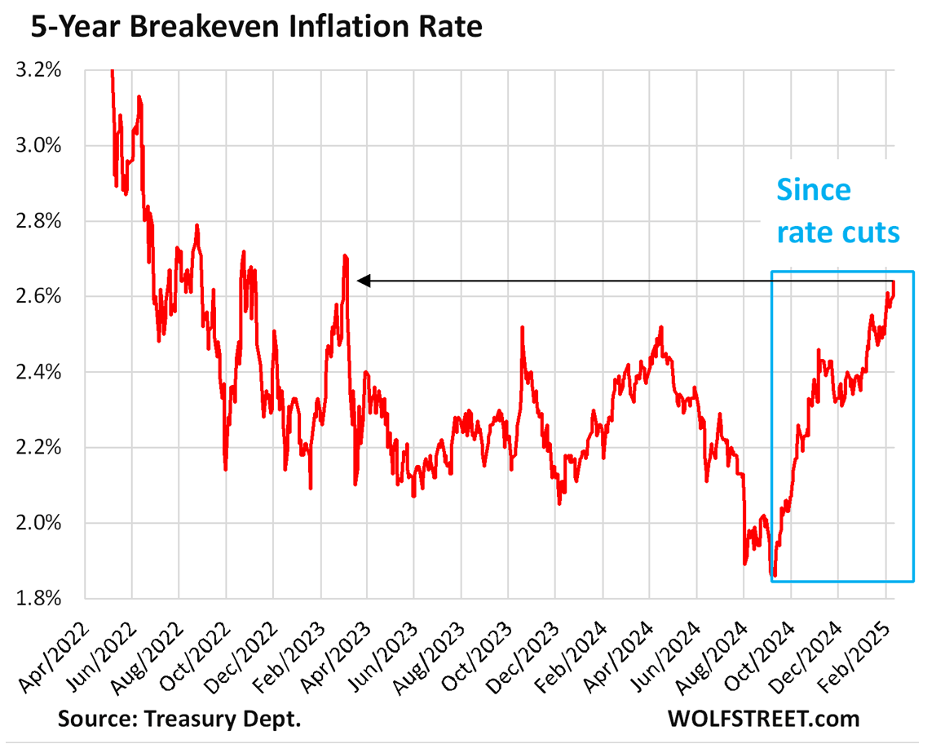 Looking over the past 10 years of data, that is a pretty disturbing spike, taking us right back to the 2022-23 period when inflation was roaring. In addition to that little jump, it is worth looking at those market measures that Powell frequently mentions. Typically, they are either the 5-year or 10-year breakeven rate. That rate is the difference between the 5-year Treasury yield and the 5-year TIPS yield (or correspondingly the 10-year yields). A quick look at the chart below shows that since the Fed first cut rates in September 2024, the 5-year breakeven rate has risen 78bps to 2.64%. Certainly, looking at the chart, the idea of ‘well anchored’ isn’t the first description I would apply. Perhaps, rocketing higher?